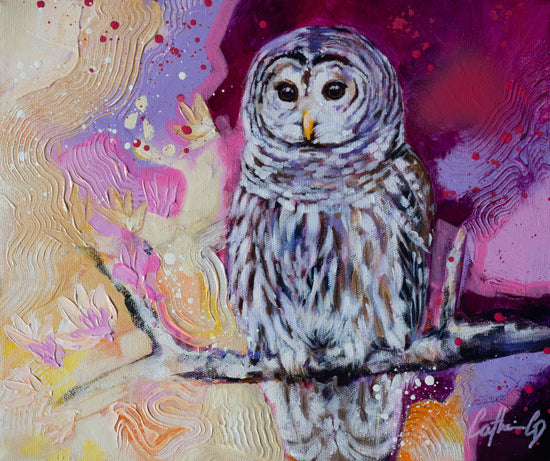 Veilleuse montre une chouette rayée perchée sur une branche, dans la nuit tranquille. Elle veille en silence.
